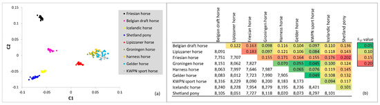 Visualization and quantification of relationships among the populations on the dataset pruned for LD: (a) multidimensional scaling plot of 184 horses from 9 populations sampled in the Netherland. The X-axis represents the first component (C1) and Y-axis the second component (C2) as calculated with the cluster and mds-plot commands in PLINK software (version 1.9) [15,16]; (b) mean FST values (above diagonal) and number of SNPs (below diagonal) on which the calculations between the populations are based.