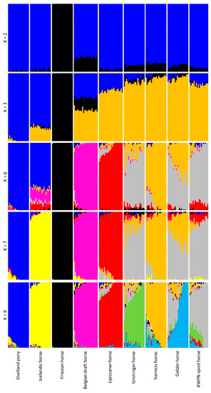 Inferred population structure for K = 2, 3, 6, 7 and 9 based on data of the sampled horses from 9 populations. The proportion of genome that is assigned to a particular cluster is represented by a particular color, where the proportion of the genome is shown on the Y-axis (0 to 1) and each vertical bar represents an individual horse on the X-axis.