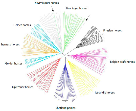 - Petersen, J.L.; Mickelson, J.R.; Cothran, E.G.; Andersson, L.S.; Axelsson, J.; Bailey, E.; Bannasch, D.; Binns, M.M.; Borges, A.S.; Brama, P.; et al. Genetic diversity in the modern horse illustrated from genome-wide SNP data. PLoS ONE 2013, 8, e54997. [Google Scholar] [CrossRef]