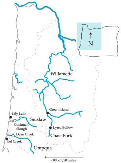 Site map in Oregon. Filled and open points represent freshwater and estuary, respectively. Two inland freshwater populations and four coastal populations were sampled.