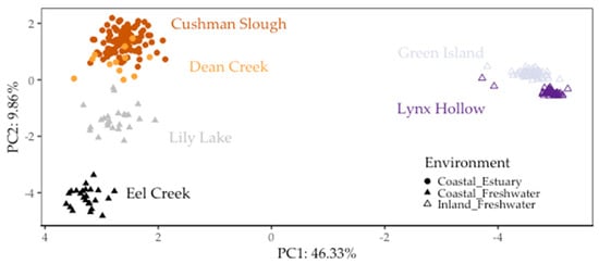 Using PCA, we found genetic variation in the populations that we sampled was mainly partitioned between geographic regions and to a lesser extent between environments, confirming previous findings [,]. The first PC (PC1), accounted for 46.33% of the overall genetic variation partitioned genetic variation between populations collected along the coast and those collected inland in the Willamette Basin. PC2 accounted for 8.56% of overall genetic variation grouped coastal populations separately by environment (estuary vs. freshwater) (Figure 2). In congruence with these PCA results, average population genetic divergence, as measured by FST in pairwise comparisons between coastal and inland fish populations, was on average two-fold greater (~0.242) than between inland (~0.125) and four-fold greater than that among coastal populations (~0.063) (Table 3).