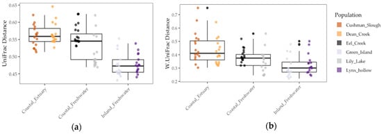 Gut microbiome beta diversity among threespine stickleback populations in terms of distance-to-centroid transformed: (a) Unweighted UniFrac distance (b) Weighted UniFrac distance. Colors represent collection sites (“populations”). Each point is a fish gut. Mid-box lines are pooled means of major environments (e.g., Coastal Freshwater”). Box whiskers are pooled standard deviation of major environments, as well.
