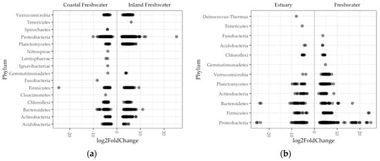 Significant differential ASV abundance in fish gut microbiome was determined between: (a) Inland and coastal regions; (b) and freshwater and estuary environments in Oregon. Each point (darker points are overlapped points) is an ASV that is enriched in a phylum. Negative and positive log2fold values are enrichments in on either side of x-axis, for example, in estuary and freshwater fish guts, respectively.