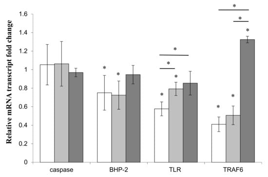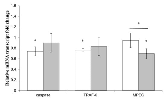 Total RNAs were isolated from primmorphs using the extraction solution RNA now (Epicentre, Madison, WI, USA) and DNase treated (Epicentre, Madison, MI, USA) according to the manufacturer’s instructions. A total of 500 ng of total RNAs were used to synthesize first-strand cDNAs using oligodT primers with MultiScribe Reverse Transcriptase (Applied Biosystem, Foster City, CA, USA) according to the manufacturer’s instructions. A negative control was included using total RNAs without the MultiScribe Reverse Transcriptase. mRNAs of interest were quantified by real-time PCR amplification of their cDNAs. The relative mRNA transcript changes in connection with every treatment were studied for the caspase-like 3/7, BCl2-homolog protein (SDBHP-2), the Toll-like receptor (TLR), the TNF receptor associated factor 6-like protein (TRAF-6) or the macrophage expressed gene (MPEG) genes, using the genes Hypoxanthine-guanine phosphoribosyltransferase (HPRT) and glyceraldehyde-3-phosphate dehydrogenase (GAPDH) as housekeeping genes []. PCR reactions were performed in triplicate with the 7300 Real Time PCR System apparatus (Applied Biosystems, Foster City, CA, USA). A total of 20 mL of reactions contained 10 μL SYBR Green PCR Master Mix (including AmpliTaq Gold DNA Polymerase) (Applied Biosystems, Foster City, CA, USA), 2 μL of each primer (3 mM) and 8 μL of cDNAs. For each experiment, three serial cDNA dilutions were made: 250.0, 25.0 and 2.5 pg·mL−1. qPCR conditions were 95 °C for 10 min for polymerase activation, and 40 cycles at 95 °C and 60 °C for 60 s and 30 s, respectively. The relative quantification of the mRNAs of interest was obtained by the comparative Pfaffl method [] using HPRT or GAPDH as endogenous control []: