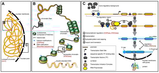 Highly transcribed regions of the genome (i.e., euchromatin) are—in contrast to the condensed heterochromatin—usually depleted of nucleosomes (Figure 1B). These nucleosome free regions can be detected on a genome wide scale using NGS based methods such as ATACseq (Assay for Transposase-Accessible Chromatin using sequencing) [] (Table 1). Recent application of ATACseq on single cells originating from 13 different mouse tissues [] and from three stages of Drosophila embryonic development [] revealed clear signatures of cell type and stage specific chromatin accessibility states. The chromatin state and thus DNA accessibility is influenced by cell type specific modifications of histone proteins [,], the subunits of nucleosomes, and is clearly linked to gene regulation [,]. Even if DNA is accessible, the transcription of genes can be modulated by DNA methylation, i.e., the addition of a methyl group to cytosines. DNA methylation has been associated with gene repression [,] and recent data has shown that transcription factors can integrate methylation patterns to refine gene regulation []. Since the methylation is highly dynamic, for instance throughout cellular differentiation [], it facilitates context dependent gene regulation.