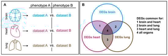 Generic factors that are expressed across different tissue can be excluded in correlation studies. (A) If specific candidate genes that are differentially expressed between phenotype A and B are supposed to be revealed, one can generate a comparable dataset for additional tissues. (B) Each pairwise comparison will reveal a certain number of differentially expressed genes (DEGs). The DEGs that are common in two (1–3) or all organs (4) are most likely generic factors that may be less informative for follow-up analyses.