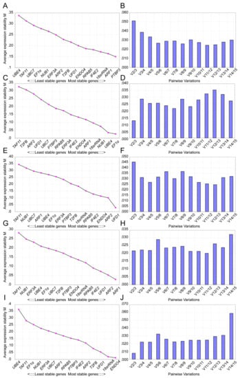 geNorm analysis of the values of average expression stability (M) and pairwise variation (Vn/Vn+1) for the candidate reference genes. M and pairwise variation (Vn/Vn+1) were calculated on the basis of 2−ΔCt (ΔCt = the corresponding Cq value – minimum Cq) by geNorm. Lower M values indicate more stable gene expression. Ranking of the gene expression stability was determined in presented samples. According to the algorithm and software instructions, the cut-off V value of 0.15 was used to determine the optimal number of reference genes for RT-qPCR normalization. (A–B) Values of M and Vn/Vn+1 for the reference genes in the four cotton cultivars. (C–D) Values of M and Vn/Vn+1 for the reference genes in YZ1. (E–F) Values of M and Vn/Vn+1 for the reference genes in R15. (G–H) Values of M and Vn/Vn+1 for the reference genes in X33. (I–J) Values of M and Vn/Vn+1 for the reference genes in X42.