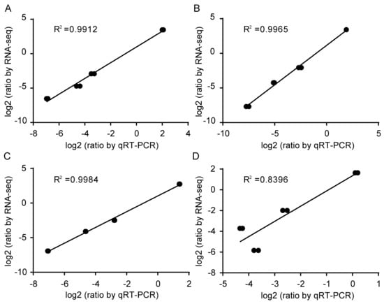 Correlation analysis between RT-qPCR results and the RNA-Seq data. X-axis represented log2(ratio by RT-qPCR), and equation 2−ΔCt was applied to calculate the RT-qPCR relative expression level using selected target genes as the reference gene. Y-axis represented log2(ratio by RNA-Seq) (p-value ≤ 0.01). Correlation analysis using ENDO4 and 18S rRNA was used as the internal controls for normalization of AUX22 and ERF17 in YZ1 (A), R15 (B), X33 (C), and X42 (D).