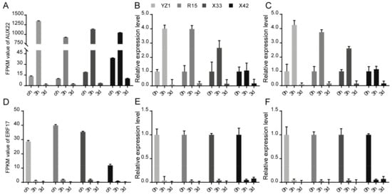 Validation of the reference genes of 18S rRNA and ENDO4 as internal controls for normalization of target gene expressions of AUX22 and ERF17. The results were shown as mean fold changes in relative expression when compared to 0 h. (A) The FPKM values of AUX22 in RNA-Seq data. (B) The expression profiles of AUX22 normalized using 18S rRNA as an internal control. (C) The expression profiles of AUX22 normalized using ENDO4 as an internal control. (D) The FPKM values of ERF17 in RNA-Seq data. (E) The expression profiles of ERF17 normalized using 18S rRNA as an internal control. (F) The expression profiles of ERF17 normalized using ENDO4 as internal control.