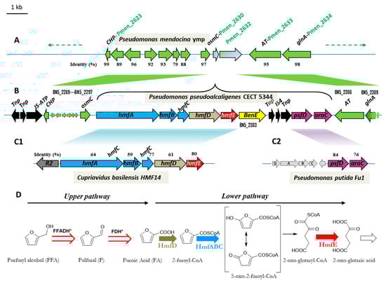 - Nichols, N.N.; Mertens, J.A. Identification and transcriptional profiling of Pseudomonas putida genes involved in furoic acid metabolism. FEMS Microbiol. Lett. 2008, 284, 52–57. [Google Scholar] [CrossRef] [PubMed]