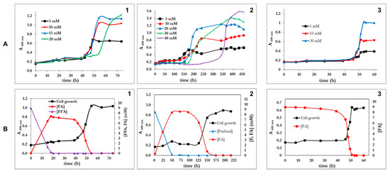 (A) Growth curves of Pseudomonas pseudoalcaligenes CECT 5344 R1 with different concentrations of furfuryl alcohol (panel A1), furfural (panel A2) or furoic acid (panel A3). (B) Growth curves and concentrations of furanic intermediates in the culture media of P. pseudoalcaligenes using as a carbon source either 5 mM furfuryl alcohol (panel B2), furfural (panel B2) or furoic acid (panel B3). Three independent experiments gave similar results.