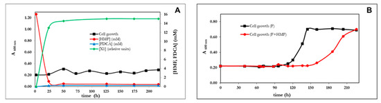 Biotransformation of HMF by P. pseudoalcaligenes CECT 5344 R1. (A) Cell growth (black line), concentration of HMF and FDCA (mM), and an unknown metabolite in cell cultures of P. pseudoalcaligenes. (B) Effect of HMF (5 mM) on the cell growth of P. pseudoalcaligenes at the expense of 10 mM furfural (F+HMF) in comparison with the cell growth with 10 mM furfural (F, black line). Similar results were obtained in three different experiments.