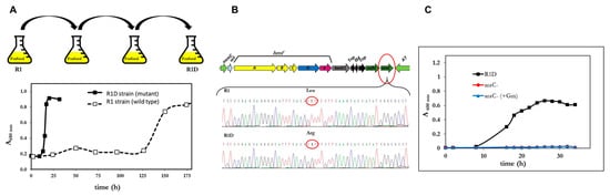 Once grown on furfural as a C-source, the serial dilutions of a culture of P. pseudoalcaligenes CECT 5344 R1 spread on solid minimal medium with furfural or FA giving colonies with two morphologies, big or small colonies. The small colonies had the same phenotype as the original stain (R1), but the big colonies grew faster on furfural even after successive generations on non-selective medium (LB). In fact, after four serial re-inoculations of the bacteria in in fresh media with furfural (10 mM) as the sole carbon source, allowed the selection of a mutant (big colonies in FA plates) in which the growth lag phase was drastically reduced and had a reproducible growth rate of 0.29 h−1 on furfural (5 mM). Figure 4A illustrates the isolation of the mutant, thereafter called R1D, and its phenotype in comparison to the wt. The selection of mutants with improved capacities has been widely used in biotechnological processes for the selection of evolved phenotypes, although having poor knowledge of their underlying genotype [31], also in the context of furfural assimilation [32]. For example, P. putida S12 expressing the hmfABCDE genes from C. basilensis HMF14 strain, was only able to efficiently assimilate furfural when adapted by repeated inoculation in media with furfural. The same has been recently described for Pseudomonas putida KT2440 expressing a 12 kb DNA fragment containing the hmf gene cluster from Burkholderia phytofirmans [33]. The next generation sequence (ngs) techniques open the possibility to analyze the genotypic variation associated with the evolved phenotypes. Adaptive laboratory evolution (ALE) takes profit of this advantage and may have a tremendous application in the rational design of genetically manipulated microorganisms, as well as in understanding some basic evolving mechanisms of living beings [31,34,35]. In our laboratory, the transcriptomic analysis of the R1D mutant in response to furfuryl alcohol was analyzed and it revealed to be more complex than expected (not shown). Interestingly, the transcriptomic reads sequences (RNA-seq) were obtained from the mutant strain (R1D), whereas the genome sequences available are from the wt strain [36]. The comparison of both sequences in the hmf locus revealed that the R1D mutant had a point mutation in a possible regulatory gene of the araC family. The presence of the mutation was confirmed by re-sequencing the araC gene (BN5_2307) (Figure 4B). The observed point mutation was a transversion (782T>G), leading to the non-conservative change of the triplet CTT (Leu) to CGT (Arg) (Figure 4B). The alignment of several AraC proteins revealed that the Arg in position 261 is a conserved residue in most members of this family of regulators (not shown). This position is located in the HTH domain of the protein and it is also conserved in E. coli [37], thus suggesting its essentiality. In conclusion, it seems that the pathway for the assimilation of FA is not active in the wt strain of P. pseudoalcaligens because AraC is not functional, and that the L262R mutation generates the active and functional regulator (AraC*) in the evolved R1D strain. In order to check this hypothesis, a mutant of the araC* gene of P. pseudoalcaligenes CECCT 5344 R1D was generated by double recombination. As expected, the mutant strain was unable to use furfural as a C-source (Figure 4C).
