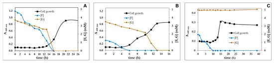 It is evident that R1D is an evolved strain much more efficient than the wt in the assimilation of FFA, F and FA. Nevertheless, the utilization of these capabilities for the elimination of the inhibitory compounds from lignocellulosic hydrolysates requires that the bacterium leave the sugars intact for their further fermentation process. P. pseudoalcaligenes CECT 5334 was unable to use as a C-source neither xylose, sucrose, arabinose, mannose, nor galactose. The capability of P. pseudoalcaligenes to use sugars was restricted to glucose. The chemical composition of the lignocellulosic hydrolysates depends on the raw material utilized and the treatment employed [39]. Therefore, the capacity of P. pseudoalcaligenes CECT 5344 R1D to use glucose and furfural simultaneously was studied. As expected, R1D assimilated both compounds simultaneously in blended media (Figure 6). From Figure 6, it became evident that F is toxic, since maintaining the concentration of glucose, the lag phase increased when furfural concentration increased (Figure 6A,B). In any case, since both glucose and F were assimilated simultaneously by P. Pseudoalcaligenes, the construction of a mutant impaired in glucose assimilation was designed. Most Pseudomonas, which have a relatively limited ability to assimilate sugars, usually assimilate glucose through the Entner-Doudoroff pathway [40], and the inactivation of the edd gene usually causes the inability to assimilate glucose [41]. As shown in Figure 6C, the edd− strain was as efficient as R1D assimilating furfural but glucose remains unaltered in the culture media. The edd− mutant was also able to use furfuryl alcohol and furoic acid as a C-source.