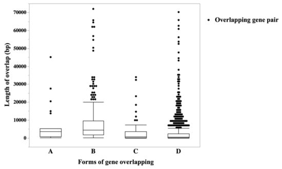 A total of 1261 overlapping genes (~4% of annotated genes) were identified among all the analyzed samples (Supplementary Materials Table S3). This number is similar to the 1210 genes that represent the total number of SAS pairs expressed in the human genome []. In another study, a total of 615 and 497 different-strand overlapping pairs were identified in both human and mouse genomes, respectively []. It is noteworthy that the numbers of overlapping pairs represent approximately 10% of annotated genes. The overall median length of overlap was 985 bp (1 and 72,094 bp; minimum and maximum, respectively (Figure 2 and Supplementary Materials Table S3)). In total, 15 detected overlapping pairs had an overlap of only 1 bp. Further, we demonstrated that the head-to-head (D; ~70%) form of overlap was the most common SAS pairing, followed by embedded (A and B; ~25%) and tail-to-tail (C; ~5%) forms. This was similar to the finding of Sanna et al., in which majority of the overlap in human and murine genomes were head-to-head (D: ~50%), followed by embedded (A and B; ~29%), and tail-to-tail forms (C; ~21%) []. We, however, found a lower number of tail-to-tail overlap in our dataset. These analyses depend on accurate annotation of the length of the 3’ end of the gene. Annotation engines will mask regions of low complexity resulting in artificially short 3’ ends.