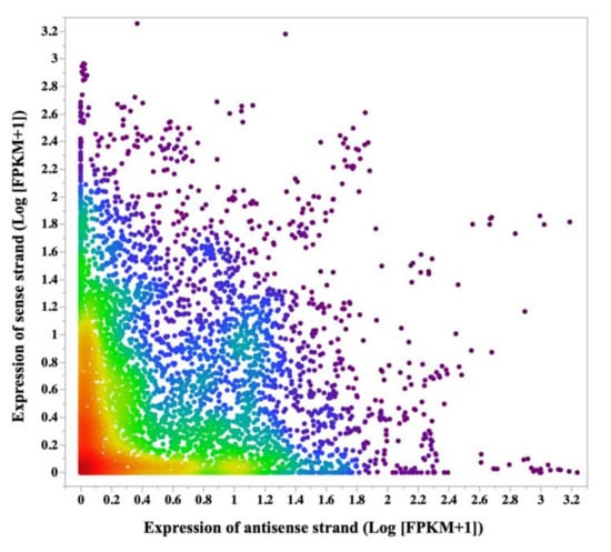 Density plot of sense and antisense strand expression. Expression in sense and antisense strands was calculated for each locus per sample. There was a numerical slight skew in the expression pattern toward antisense strand, and the sense strand showed an overall lower expression than the antisense strand (visible in the red and green dots; median of antisense expression/sense expression = 1.19). For the preparation of the density plot, the FPKMs values (Fragments Per Kilobase of transcript per Million mapped reads) were presented as Log10 (FPKM+1).
