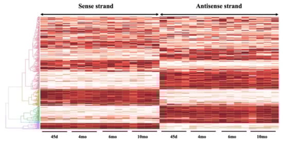 The raw read files (fastq) of a previously generated, strand-specific RNA sequencing dataset from equine chorioallantois during different stages of gestation (45 days, four, six, and ten months; four samples per time point, GSE108279) were obtained from the National Center for Biotechnology Information (NCBI) database []. The reads were initially trimmed for adapters and quality using TrimGalore Version 0.4.4 (Babraham Bioinformatics, Cambridge, UK). Next, the reads were mapped to the equine genome (EquCab 3.0) using STAR (Release 2.5.2b) allowing a maximum of five mismatches []. The mapped reads were then phased based upon the strand of transcription (termed Sense and Antisense strands) using SAMtools Version 1.3.1 []. Each strand was annotated (-g) using the equine reference transcriptome available in NCBI database (EquCab3.0; GCF_002863925.1, gff-spec-version 1.21, downloaded on March 2018) using Cufflinks (Release 2.2.1; http://cole-trapnell-lab.github.io/cufflinks/) [], generating 32 samples (16 sense and 16 antisense). The start and end positions for each gene were identified and the overlap between the location of the gene in sense and antisense strands was identified using an in-house program written in java. The correlation was analyzed using Spearman correlation in JMP13 Pro statistical analysis software (SAS Institute, Cary, NC, USA), and the heatmaps were built using Package ‘d3heatmap’ in R []. Significant level was set at corrected p-value < 0.05 (using the Benjamini-Hochberg correction by ’p.adjust’ function in R). Gene ontology analysis performed using the protein analysis through evolutionary relationships classification system (PANTHER; Release 13.1) []. PANTHER classification system was used to functionally annotate genes based on gene ontology (biological process).