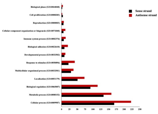 Biological functions of genes from sense and antisense strands were predicted based on gene ontology (biological process). The number of genes involved in each function is presented in the x-axis.