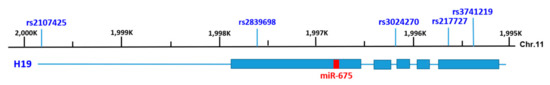 Genomic structure of human H19 and locations of the single-nucleotide polymorphisms (SNPs) examined in this study. The genome structure of human lncRNA H19 is within the region of 1995 K–2000 K bp of chromosome 11 for the GRCh38.p12 primary assembly. H19 contains 5 exons as represented by boxes in blue and flanking introns shown by lines. miR-675, which is embedded in the 1st exon of H19, is indicated by the red box. The five SNPs tested, rs2107425 (in the promoter region), rs2839698 (exonic), rs3024270 (intronic), rs217727 (exonic) and rs3741219 (exonic), are shown above the scale.