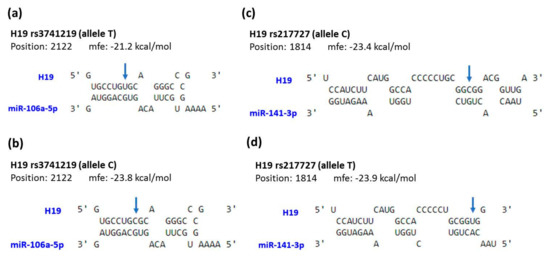In addition, to provide a preliminary assessment of how the change in the exonic sequences affects the putative function of H19, a bioinformatic analysis for the interaction of H19 with its microRNA targets was performed. H19 was previously reported to act as a natural sponge for many microRNAs [39,40,41]. Here, we showed that transcripts of H19 derived from distinct genotypes for three exonic SNPs examined in this study had different affinities and formed different secondary structures with miR-106a and miR-141 (Figure 2).
