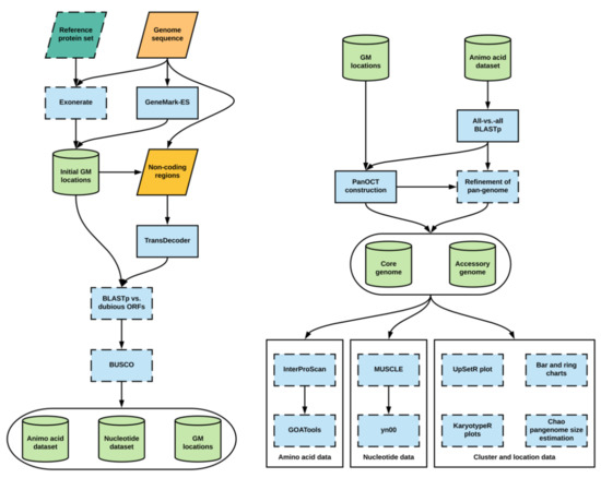 - Fouts, D.E.; Brinkac, L.; Beck, E.; Inman, J.; Sutton, G. PanOCT: Automated clustering of orthologs using conserved gene neighborhood for pan-genomic analysis of bacterial strains and closely related species. Nucleic Acids Res. 2012, 40, e172. [Google Scholar] [CrossRef] [PubMed]