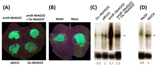 As shown above, NbAGO2 was responsive to TMV infection and MeSA treatment. Involvement of NbAGO2 in TMV infection was further investigated as follows. NbAGO2 was first silenced by pBI121-amiR-NbAGO2 agroinfiltration, and after one day the same leaf region was agroinfiltrated with TMV-GFP, an infectious TMV engineered to express green fluorescent protein, which was retained in the infiltrated area for at least 6 days. The inoculated leaves were monitored daily for the appearance of GFP fluorescence. As shown in Figure 6A, silencing of NbAGO2 caused stronger accumulation of virus (GFP fluorescence) as compared to control empty vector (pBI121) inoculated leaves. In accordance with this, overexpression of NbAGO2 (Ox-NbAGO2) resulted in weaker virus accumulation, and this effect was abolished by simultaneous amiR-NbAGO2 expression. In addition, virus spread was reduced by treatment with MeSA (Figure 6B). TMV RNA level was also determined by Northern blot experiment with CP (Capsid protein) region-specific probe, and the result was consistent with GFP fluorescence data (Figure 6C,D). Taken together, we concluded that NbAGO2 was an antiviral factor effective against TMV, and SA was implicated in this process by inducing NbAGO2 expression, at least to some extent.