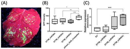 As a core element in RISC formation, AGO2 plays an important role in RNAi-mediated disease resistance response. We therefore hypothesized that some miRNA, especially which participate in RNAi, may have an effect in the process. We chose three miRNAs to further verify this. Among them, miRNA390a and miRNA393a were reported to influence the activity of AGO2 by binding to it [41], while miRNA403a was reported to mitigate AGO2 expression by posttranscriptional regulation [42]. Short tandem target mimic (STTM) is a complementary RNA which blocks small RNA functions in plants by sponge activity. Therefore, we designed an STTM inhibitory vector for each miRNA to examine functions of these miRNAs in virus defense according to the methods described by Tang et al. [43]. After co-inoculation with STTM constructs and TMV-GFP via agroinfiltration in N. benthamiana plants, the GFP fluorescence was observably weakened in STTM_miR390a, STTM_miR393a, and STTM_miR403a co-infected area at 6 DPI compared to pGreen_GUS_competitor, which served as the control construct (Figure 7A). Subsequently, fluorescence intensity was quantified, and the GFP intensity of STTM co-expressed groups, especially that of STTM_miR403a, showed statistical differences compared with the control (Figure 7B). In the subsequent analysis, we found that miR403a had a target site in 3′ UTR of NbAGO2 transcript (Supplementary Figure S4). STTM_miR403a expression reduced NbAGO2 mRNA level (Figure 7C), while STTM_miR390a, STTM_miR393a expression did not alter NbAGO2 mRNA level. Our data showed the regulatory role of miR403a on the expression of NbAGO2 as well as its role in antiviral response.