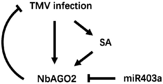 The role of NbAGO2 gene against TMV infection was investigated in N. benthamiana. NbAGO2 was demonstrated to be involved in RNAi process in N. benthamiana. NbAGO2 mRNA level was elevated by both TMV infection and MeSA treatment. Suppression of NbAGO2 gene by amiR technology compromised plant resistance against TMV infection. Inhibition of endogenous miR403a, a predicted regulatory microRNA of NbAGO2, reduced TMV infection. Taken all this together, we conclude that SA participates in NbAGO2 mediated TMV response and miR403a is also involved in this response by post-transcriptionally regulating NbAGO2 expression (Figure 8).
