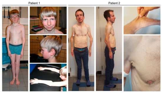 Clinical characteristics in subjects F1:II-1 and F2:II-1. Subject F1:II-1 displays mild facial dysmorphism with a flat face, deep-set eyes, a long and narrow nose, large ears and mild webbing of the neck. Craniofacial features in patient F2:II-1 are more pronounced and include dolichocephaly, a high forehead, biparietal narrowing, downslanting eyes, a convex nasal ridge, midfacial hypoplasia, micrognathia and low-set ears. No hair abnormalities were observed. Both have lax and hyperextensible skin, marked joint hypermobility and deformities of the proximal radius.