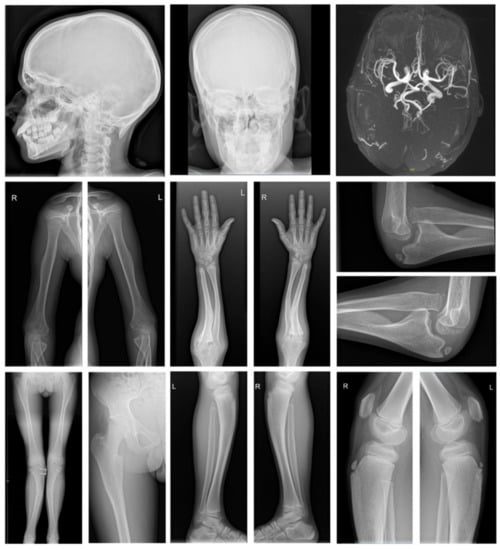 Total skeletal radiography and MRI/MRA studies in subject F1:II-1 showing severe skeletal dysplasia with occipital horns, undertubulation of bony structures and broadening of the ventral end of the first left rib, both claviculae and scapular neck, bowing of the long bones with mid-diaphyseal broadening, bilateral luxation of the radial heads, bilateral overgrowth of the ulnar coronoid processes, prominent trochanter minor of both femurs, short fibula, bilateral coxa valga with rounded iliac wings and broad metatarsals. Brain MRI and angiography showed tortuous intracranial arteries and normal brain structure.