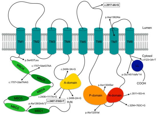 ATP7A mediates (1) copper transport from the gastrointestinal tract into the bloodstream, (2) intracellular delivery of copper to cupro-enzymes in the secretory pathway and (3) efflux of excess copper from the cell [,]. Intracellular ATP7A trafficking is essential for copper homeostasis. Under basal low copper conditions, ATP7A is found in the trans-Golgi network, where it is essential for cupro-enzyme biogenesis. At higher copper concentrations, it reversibly localizes to the plasma membrane and post-Golgi compartments, where it is responsible for the extrusion of excess copper from the cell [,,]. The ATP7A gene maps to Xq13.3 and spans a genomic region of ~140 kb. Its predominant transcription product contains 23 exons [,,,,]. ATP7A belongs to the large P-type ATPase family, which are ATP-driven membrane pumps essential in the maintenance of electrochemical gradients (such as Na+/K+-, H+/K+- and Ca2+-pumps), as well as lipid and cationic homeostasis [], including ATP7A and ATP7B, both important for copper homeostasis [,]. P-type ATPases share a structural core containing a transmembrane (TM) domain responsible for transport and an N-, P- and A- soluble catalytic domain, respectively involved in nucleotide binding, phosphorylation and dephosphorylation []. The transmembrane domain of ATP7A contains eight transmembrane helices (TM1–TM8). Six amino terminal domains contain metal-binding CXXC motifs (MBD1–MBD6) [,].