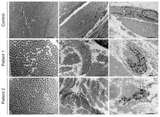 For transmission electron microscopy, 3 mm skin fragments from both individuals and an age- and sex-matched control were immersed in a fixative solution of 2.5% glutaraldehyde and 4% formaldehyde in Na-Cacodylate buffer 0.1 M, placed in a vacuum oven for 30 min and left rotating for 3 hours at room temperature. This solution was later replaced with fresh fixative and samples were left rotating over night at 4 °C. After washing, samples were post-fixed in 1% OsO4 with K3Fe(CN)6 in 0.1 M NaCacodylate buffer, pH 7.2. After washing in double-distilled H2O, samples were subsequently dehydrated through a graded ethanol series, including bulk staining with 2% uranyl acetate at the 50% ethanol step, followed by embedding in Spurr’s resin. To select the area of interest on the block and in order to have an overview of the phenotype, semi-thin sections were first cut at 0.5 µm and stained with toluidine blue. Ultrathin sections of a gold interference color were cut using an ultramicrotome (Leica EM UC6, Wetzlar, Germany), followed by post-staining in a Leica EM AC20 for 40 min in uranyl acetate at 20 °C and for 10 min in lead stain at 20 °C. Sections were collected on formvar-coated copper slot grids. Grids were viewed with a JEM 1400plus transmission electron microscope (JEOL, Tokyo, Japan) operating at 80 kV.