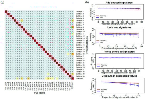 Performance of SCINA on simulated data. (a) Heatmap showing the overlap between the simulated cell types and the detected cell types by SCINA. (b) Challenging the SCINA algorithm by adding different types of noise: additional signatures for non-existent cell types, lack of true signatures for existing cell types, extra irrelevant genes in signatures, and simulated gene expression dropouts. Each scenario was repeated 10 times, and each repeat was performed on a newly-simulated matrix of 4000 cells. Performance is judged by Adjusted Random Index (ARI) and percentage of cells correctly assigned (ACC).