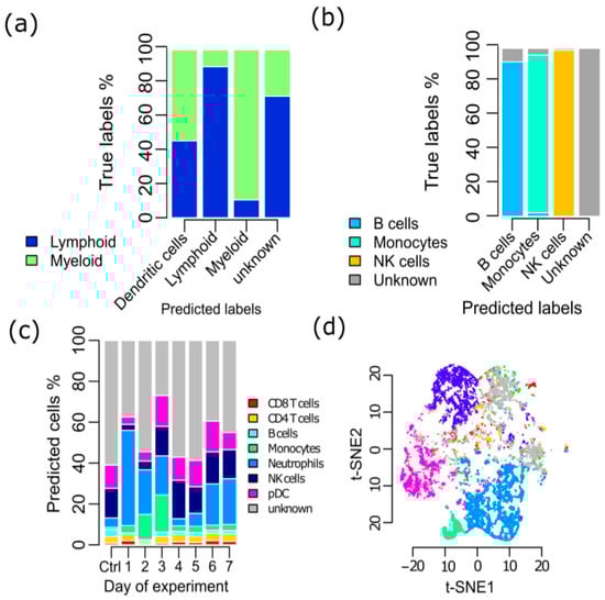 Validation of SCINA on real data (a) SCINA identified the cell types of CD45+ single cells enriched from Renal Cell Carcinomas (RCCs). Dendritic cells were left out of this analysis, as they could be of either lymphoid or myeloid lineage. (b) SCINA identified the cell types in a pool of cells comprised of B cells, monocytes, NK cells, and a “pseudo” unknown cell type. (c) SCINA was used to analyze the mouse CyTOF data collected each day following gland injury, which profiled an average of 389,777 cells at each time point. (d) t-SNE was used to analyze the same mouse CyTOF dataset. The cells were colored by cell types assigned by SCINA.