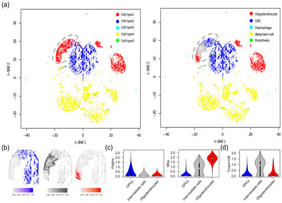 Discovery of a new stage of oligodendrocyte development in mouse brain. (a) t-SNE plot showing the clusters of cells detected by the manual inspection method employed in the original publication (left) and the cell types assigned by SCINA (right). (b) Density plots of cell type assignment probabilities generated by SCINA. (c) Violin plots showing the expression of Mbp and Pdgfra and (d) violin plot showing the expression of Tmem108 in oligodendrocyte precursor cells (OPCs), oligodendrocytes, and the intermediate stage of cells.