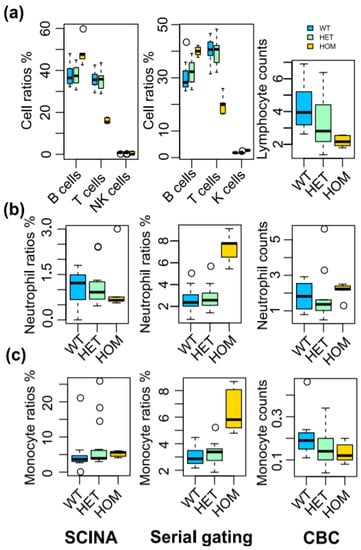 SCINA detects immune cell alterations in Stk4 KO mice. The pedigree contained a total of 12 wild-type (WT) mice, 15 heterozygous (HET) mice, and 5 homozygous (HOM) mice. The relative levels of immune cell populations are detected by SCINA from FACS data (left), the serial gating method from FACS data (middle), and CBC (right). (a) Lymphocytes, (b) Neutrophils, and (c) Macrophages.