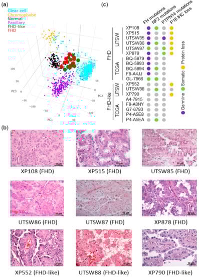 SCINA identified a novel RCC tumor clade based on gene expression profiling. (a) 3D Principal Component Analysis (PCA) plot showing clustering of UTSW KCP and TCGA RCC and normal kidney samples by expression (n = 1068). (b) H&E stained sections showing that both FH-deficient (FHD) and FHD-like tumors had features characteristic of hereditary leiomyomatosis and renal cell cancer (HLRCC), including papillary architecture, large nuclei, and prominent eosinophilic macronucleoli, with perinucleolar clearing. (c) Somatic/germline mutations and IHC results for FHD and FHD-like tumors.