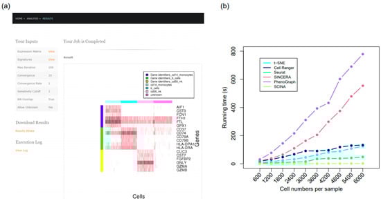 For convenience of biologists and bioinformaticians who wish to apply SCINA in their research, we have created an R package [40,41] and also a web server (Figure 7a, [42]) to host SCINA on the cloud. Importantly, the R package/webserver has provided a functionality (the heatmap) for users to visually assess the degree of bi-modal distribution of each signature gene in the particular application. SCINA is extremely computationally efficient. On the same datasets, SCINA is 20 times to over 100 times faster than Seurat, t-SNE, and Cell Ranger, and 200 to 400 times faster than SINCERA and PhenoGraph (Figure 7b).