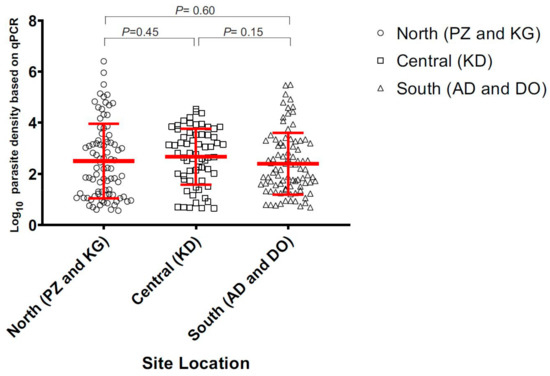 Of the 535 total samples, 105 (19.6%) were found positive by microscopy, 153 (28.6%) by 18S nested PCR, and 169 (31.6%) by 18S qPCR methods. In the north (sites KG and PZ), 24 out of 112 (21.4%) samples were microscopic-positive. The number of positive infections increased to 58 (51.8%) when screened by 18S nested PCR method (Figure 1; Supplementary Table S2). In the central (site KD), 52 of 216 (24%) samples were microscopic-positive and the number of positive infections increased to 60 (27.8%) by nested PCR. In the south (sites (DO and ADA), 29 of 207 (14%) samples were microscopic-positive. The number of positive infections increased to 35 (16.9%) when screened by nested PCR (Figure 1). The asymptomatic prevalence of infections was markedly different among the three zones, with the north being the highest and the south being the lowest. However, there was no significant difference in the parasite density measured by 18S qPCR method among the positive infections from all sites (p = 0.43; Figure 2).