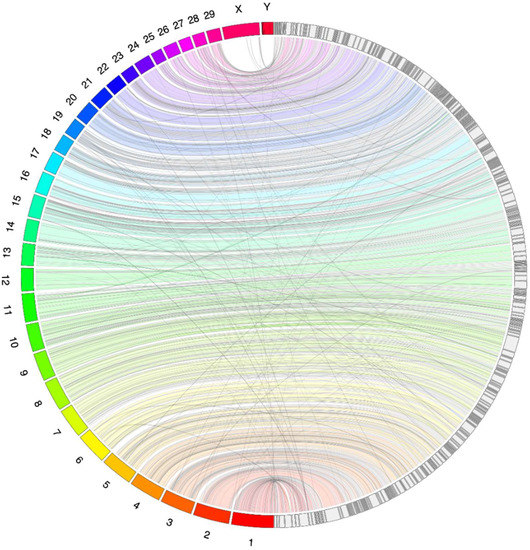 - Krzywinski, M.; Schein, J.; Birol, I.; Connors, J.; Gascoyne, R.; Horsman, D.; Jones, S.J.; Marra, M.A. Circos: An information aesthetic for comparative genomics. Genome Res. 2009, 19, 1639–1645. [Google Scholar] [CrossRef] [PubMed]