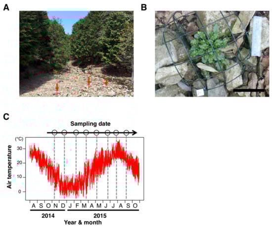 Sampling site and dates for the seasonal DNA-methylation analysis in a natural population of Arabidopsis halleri subsp. gemmifera. (A) A photograph of the study site alongside a small stream through the Cryptomeria and Chamaecyparis plantation in Hyogo Prefecture, Japan. Red arrows indicate individuals of A. halleri. (B) An individual of A. halleri in the study site. The cage was used for protection against deer herbivory. White bar indicates 100 mm. (C) Sampling dates (8 time points) and temperature regimes during the study period. Sampling was performed every ca. 1.5 month for a year. The red line indicates hourly air temperature, and dotted lines represent timings of the sampling.