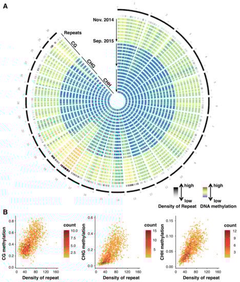 Bulk DNA methylation levels were relatively constant across the eight time points, and ca. 45%, 20%, and 6% of cytosines in the genome were kept methylated in CG, CHG, and CHH contexts, respectively (Figure S2A). The large-scale distribution of DNA methylation was determined by the positions in the genome, as represented by radial patterns in the circos plot for the longest 30 scaffolds (30.8% of the reference genome; Figure 2A). The distribution of methylated sites remained constant across the 8 sampling times (represented by 8 concentric circles for each methylation context in Figure 2A). We observed conspicuous aggregation of DNA methylation on repetitive sequences (Figure 2A). For example, scaffolds 3 and 18 are characterized by a low and high density of repetitive sequences that corresponded to relatively low and high methylation levels, respectively (Figure 2A). In the comparative analysis between genic and repetitive regions for the whole genome, the level of DNA methylation in repetitive sequences was higher than that in genes (Figure S2B). A similar pattern was confirmed by an analysis using 100 kbp windows for the whole genome (Figure 2B). The level of DNA methylation was correlated with the density of repeats in each window for all three contexts in all samples (e.g., Figure 2B for November 2014, Pearson’s correlation coefficients were 0.64, 0.68, and 0.70 for CG, CHG, and CHH context, respectively; Table S3 for the other sampling times). Although aggregation of DNA methylation at repetitive sequences was similar to the patterns previously reported in related Brassicaceae [2,3,41], seasonal stability in the large-scale distribution of DNA methylation was reported for the first time here.