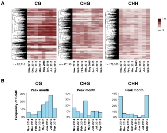 DNA methylation occurs in three contexts, according to the flanking sequence, i.e., CG, CHG, and CHH (H = A, C, or T). The former two form symmetrically and the latter one asymmetrically, in terms of sequences on the complementary strands. Since these contexts of methylation are distinctly regulated and associated with DNA replication, histone modification, and non-coding RNA production [22,23,24], we examined seasonal patterns of DNA methylation by conducting single-base resolution analyses.