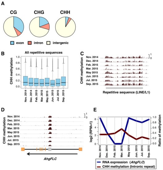 In addition, we found some repetitive sequences that showed a unique seasonal pattern of CHH methylation. For example, in the intronic repeat at the locus of FLOWERING LOCUS C homolog (AhgFLC). AhgFLC expression is regulated seasonally and suppresses flowering when it is upregulated [20]. We found that a SINE-like repetitive sequence in the first intron of AhgFLC showed a seasonal change of CHH methylation. The level was the highest in March and the lowest in June (Figure 4D). Interestingly, this seasonal pattern was opposite to that of the RNA expression of AhgFLC (Figure 4E). The presence of interactions between transcription and CHH methylation in the intragenic repeat at AhgFLC is expected.