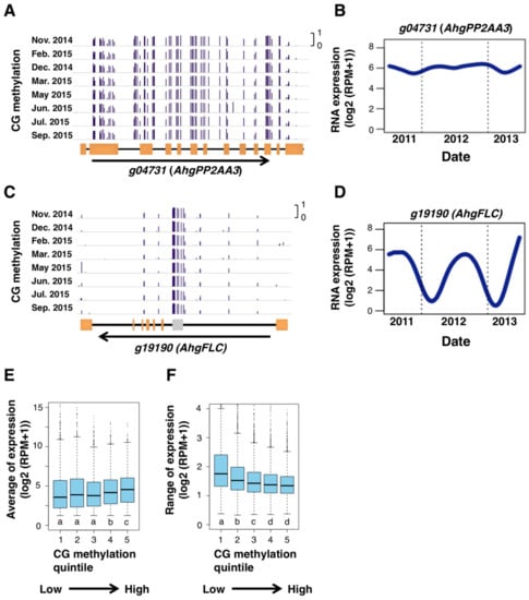 CG DNA methylation and stability of gene expression. (A–D) Browser views of seasonal patterns of CG methylation (A,C) and the two-year dynamics of RNA expression level (B,D; from September 2011 to August 2013) for AhgPP2AA3 (g04731) and AhgFLC (g19190), respectively. Orange rectangles indicate exons. A gray rectangle indicates a repetitive sequence in the AhgFLC locus. (E,F) Boxplots showing relationship between DNA methylation in CG context and the average (E) and range (F) of RNA expression of genes. Only expressed genes (average expression level (log2(RPM + 1) > 1)) are used for these analyses. Genes were split into five bins according to quintiles of genic DNA methylation in CG context. The boxes span from the first to the third quartiles, the bands inside the boxes are the medians, whiskers above and below the boxes represent 1.5 × interquartile ranges from the quartiles. Different letters represent significant differences between groups in the Mann-Whitney test, p < 0.01 adjusted for multiple comparisons.