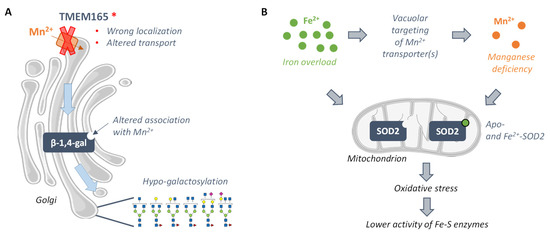 Manganese-related molecular mechanisms beyond the development of Transmembrane protein 165-Congenital Disorder of Glycosylation (TMEM165-CDG) (A) and of Friedreich ataxia (B). (A) Disease-causing mutations within the human gene coding for the Golgi-localized protein TMEM165 are thought to cause its mislocalization or to affect its transport capacity, both leading to disturbed manganese homeostasis in the Golgi lumen. In this compartment, the altered bioavailability of manganese for the Mn2+-dependent β-1,4-galactosyltransferase (β-1,4-gal) would affect its enzymatic function and lead to the production of hypo-galactosylated N-glycans. (B) Friedreich ataxia is characterized by a decreased production of the mitochondrial frataxin and by iron overload. This metal overaccumulation is, in turn, thought to induce, in yeast, vacuolar targeting of the protein Smf2p, that plays a key role in manganese dispatching within the cell, which, in turn, leads to cellular manganese deficiency. Both manganese deficiency and iron overload drive the formation of the inactive apo- and Fe-bound superoxide dismutase 2 (SOD2), thereby altering oxidative stress protection and leading to decreased activities of the Fe-S enzymes.