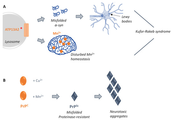 Mn2+-related molecular pathways associated with the development of two neurodegenerative diseases: the Kufor-Rakeb syndrome (A) and prion-related disorders (B). (A) Specific mutations within the human gene ATP13A2 have been shown to induce misfolding of the α-syn protein and its subsequent neurotoxic aggregation that leads to the formation of Lewy bodies in human neurons. In parallel, mutated ATP13A2 has been shown to directly disturb manganese homeostasis, thereby establishing a connection between genetics (α-syn and ATP13A2) and environmental (unbalanced manganese exposure) causes of neurodegeneration. (B) The human protein PrP interacts, in its functional isoform (PrPC), with copper, and also with manganese. This interaction with manganese has been suggested to induce the conversion of PrPC to its proteinase-resistant counterpart PrPSc. In this form, PrP forms neurotoxic aggregates, thereby leading to the prion-disease associated symptoms.