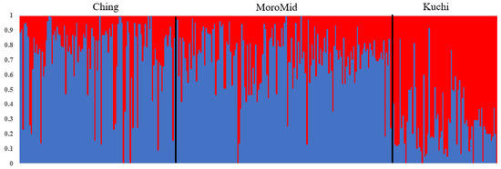 The admixture plot showing mixed ancestry among individuals for the three populations. ecotypes; Ching, Kuchi and MoroMid.