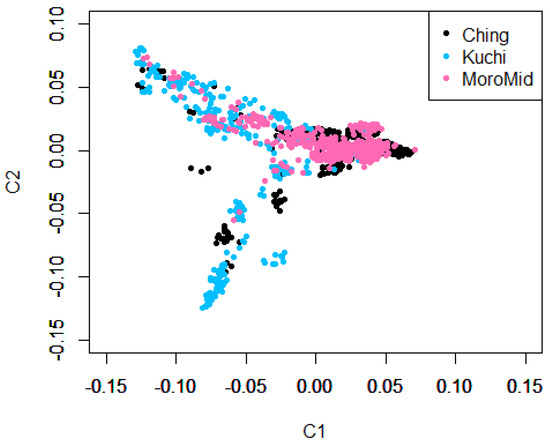 The admixture results for the three chicken ecotypes (Kuchi, Ching and MoroMid) indicated a common genetic background of the Tanzanian local chicken ecotypes that were evaluated. This admixture can be attributed to inter-mating (breeding) among chickens across different areas of the country and movement of chickens between country districts through trading and market chains. The MoroMid and Ching ecotypes were sampled from districts (regions) that neighbor each other, compared to Kuchi sample districts. The complimentary Admixture (Figure 1) and MDS (Figure 2) plots support this geography, where Ching and MoroMid birds had similar admixture patterns and clustered together in the MDS plot compared to Kuchi.