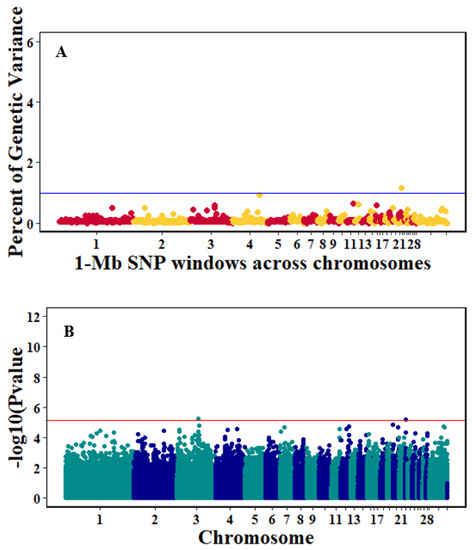 Manhattan plots showing the genome-wide association results for antibody levels at 10 dpi using Bayes-B and single-SNP analyses. (A) Bayes-B results show the percent of genetic variance explained by 1-Megabase (1-Mb) nonoverlapping windows of SNPs across chromosomes. (B) Single-SNP results show the −log10(p-value) of ordered SNPs across the chromosomes. The blue and red lines indicate genome-wide significance at 1% genetic variance and 20% suggestive adjusted Bonferroni correction, respectively.